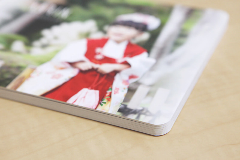 厚手のページに、手触りのいいマットプリント、角が丸く加工してあり、オリジナルのイラストも入った、絵本のような、やさしい雰囲気のアルバムです